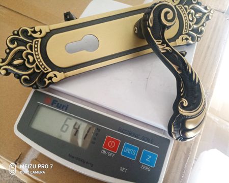 单只把手的克重640克,一斤多。所以一件纯铜室内门锁最多只能装9-12套,超出了这个数量,箱子承受不了。